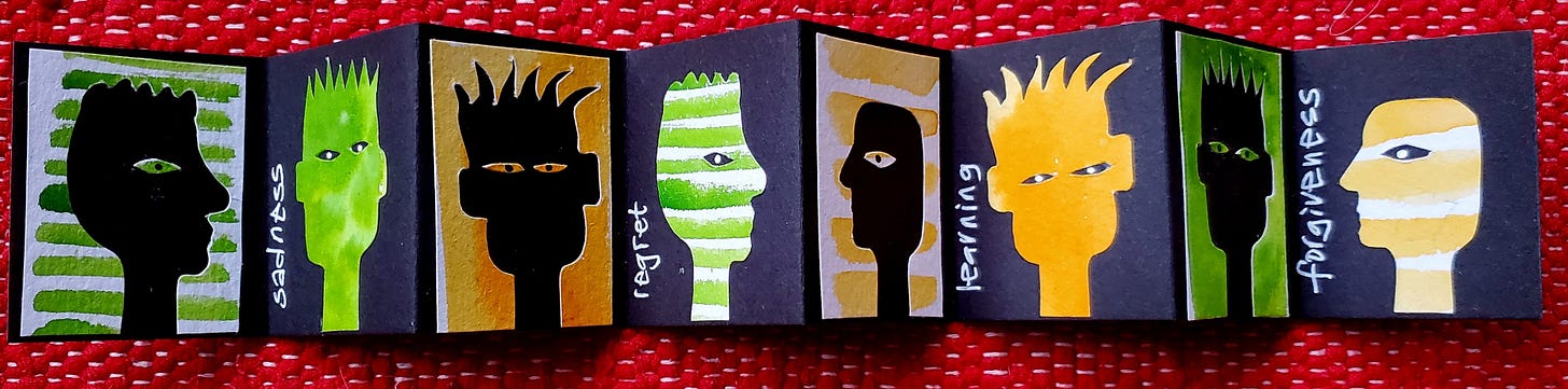 Keeping it simple to explore complexity: I use this approach frequently, and in the last few years it has become my favourite way to deploy art for both personal and research reflections. A few years ago, I created a series of mini-books to illustrate the process of engaging with one’s feeligs, while also navigating uneasy encounter between western narratives of therapy and self help, and different cultures of emotions and emotional vocabulaties.