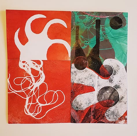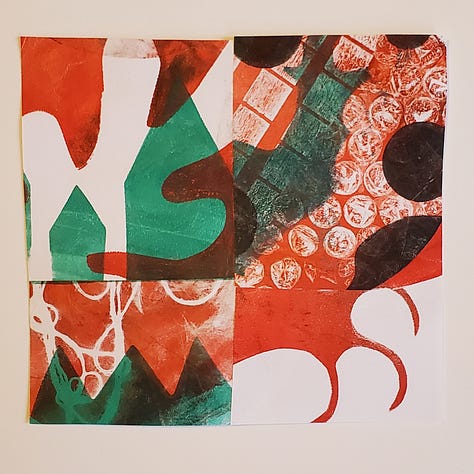 Last year, I experimented with geli printing, using just a few hand-cut paper stencils, same shapes, same figures, over and over.