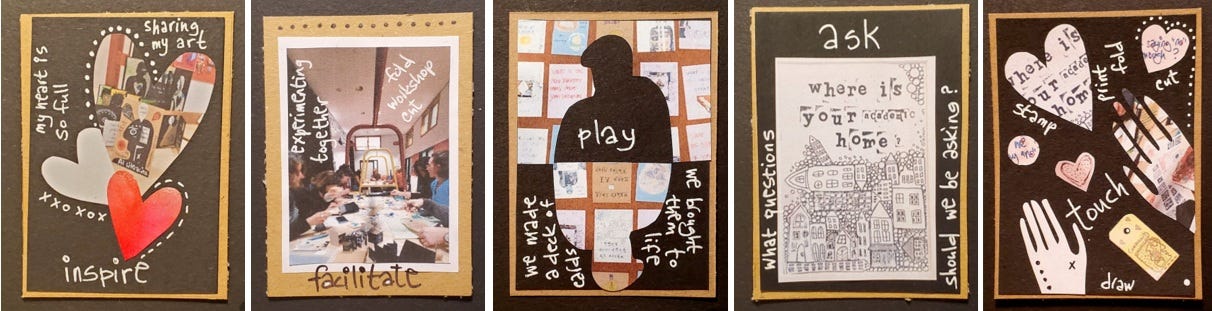 The rest of the workshop was beautifully different to how I normally work - in isolation. Here, by contrast, the main feeling was that of community. A community of intentional practice. A community of transgressive researchers. A community of creative intellectuals. A community of dreamers. What we did was inspire, facilitate, and play; touch the art materials, the air and the ground beneath our feet; and ask questions. Where is your academic home? Why does the world need this knowledge? What ligts you up? Can there be Humanities without the human?
