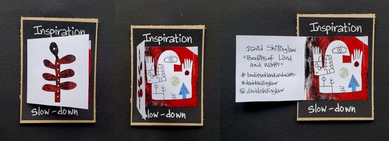 Part of this project’s journey is reflecting on other artists who have inspired me in insihtful and unusual way. This week, I am slowing down to focus on David Shillinglaw’s “Bodies of Land and Water” - a project that propelled me, some time ago, to explore writing and journalling alongside of drawings (and more specifically, as an inter-relation of text and images of human figures). As a traditionally trained academic who is also an artist, I tend to use drawing and writing separately, as two different ways of walking, breathing, thinking and creating. Apart from titles or short phrases, I have not incorporated lengthy writing in my art, nor considered writing as part of art practice. Coming across Shillinglaw’s explorations of humanness, nature, and connection shifted something for me. I year ago, I picked up a small sketchbook, and filled it with over five months of daily reflections on feelings, thoughts, relationships, connections, wounds, forgiveness, and much more, going and going until I reached the last page. This sketchbook was nothing like my many other sketchbooks because it included extensive writing as well as drawing.