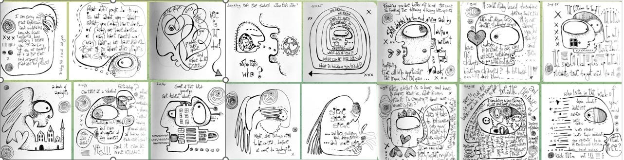 In his recent Facebook post, Shillinglaw describes how he used his “body scan” templates in workshops, for the participants to fill in with text and drawings. He shared the creations his template inspired, where “parts of a person hidden or restricted by conventions” come out in the process. It is such a powerful, gentle and evocative practice! It inspired me to think further about the use of head or body contours together with text, as a way of creating and processing research ideas. Many qualitative researchers (myself included) use project diaries as a reflective method, and some augment them with life sketches, or embelish them with doodles. However, research diaries can also be drawn+written in a more visually complex way, working analytically through the image. Filling in “body scans” with visual and textual stories is also a fantastic method of participatory research - of data creation, rather than “data collection”, carried out by research paraticipants.
